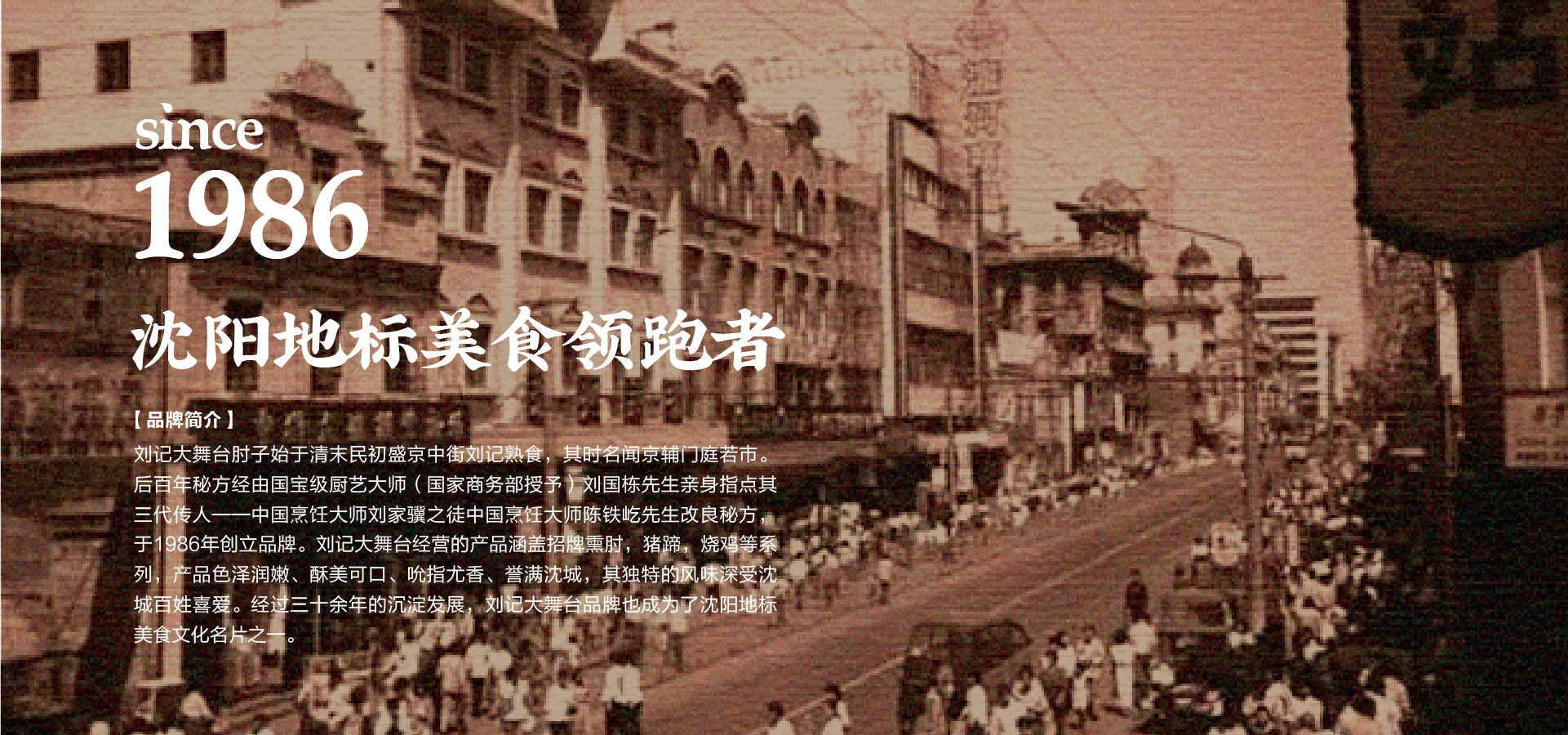 品牌創(chuàng)始人陳鐵屹先生自幼師承遼菜正宗,以發(fā)揚(yáng)傳承遼味為己任。1986年,陳鐵屹先生經(jīng)師傅指導(dǎo)調(diào)制出第一鍋醬湯,自此開始制作熟食,并于市井銷售,食客絡(luò)繹不絕。作為中華美食的傳承者、開拓者和創(chuàng)新者,陳鐵屹先生于80年代創(chuàng)立“劉記大舞臺(tái)肘子”品牌,開出了第一家門店。基于百年秘方傳承改良,并采用新鮮放心原料,秘用二十幾味名貴藥材,延用傳統(tǒng)工藝專心加工而成,形成了色澤艷麗,酥爛脫骨,肥而不膩,瘦而不柴的風(fēng)味產(chǎn)品。